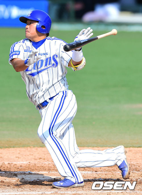 6회말 삼성 공격 2사 1, 2루 상황 이지영이 1타점 적시 안타를 날리고 있다.