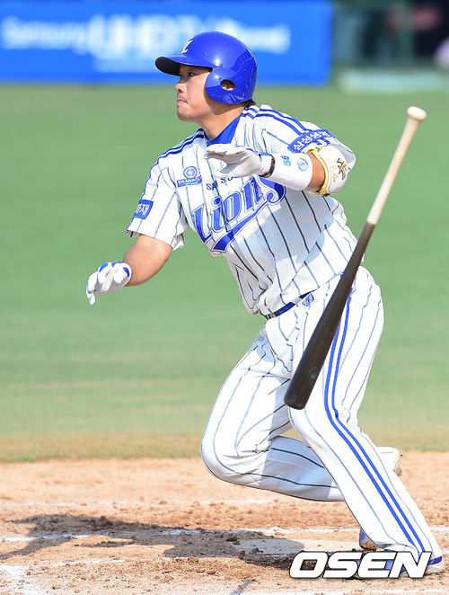 6회말 삼성 공격 2사 1, 2루 상황 이지영이 1타점 적시 안타를 날리고 있다.