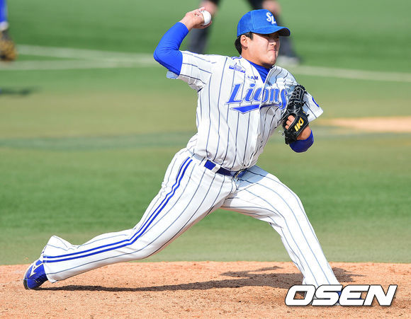 7회초 롯데 공격 마운드에 오른 삼성 투수 김현우가 힘차게 공을 뿌리고 있다.
