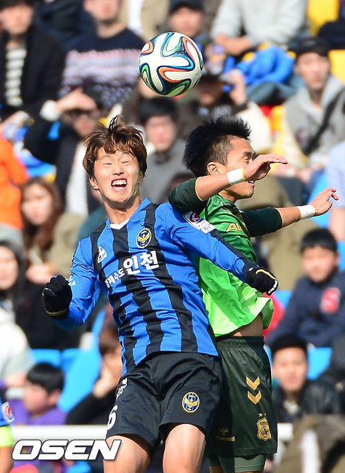 15일 오후 인천광역시 중구 도원동 인천축구전용경기장에서 열린 현대오일뱅크 K리그 클래식 2014 2라운드 인천 유나이티드와 전북 현대 경기, 후반 인천 문상윤과 전북 정혁이 공중 볼 다툼을 하고 있다.