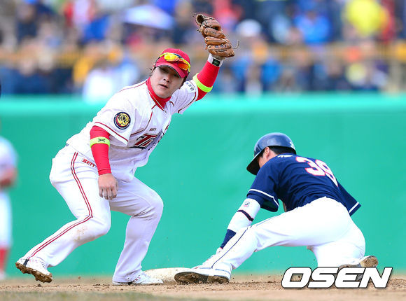 7회초 무사 1루 KIA 김선빈이 2루 도루를 시도하던 두산 장민석을 잡아내고 있다.