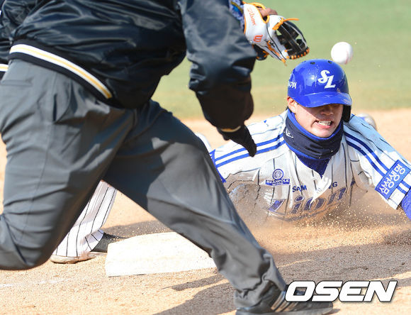 7회말 삼성 공격 무사 2루 상황 대주자 김재현이 정형식의 중견수 플라이 때 3루 태그업을 시도하고 있다. 결과는 세이프.