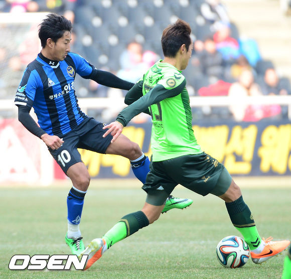 15일 오후 인천광역시 중구 도원동 인천축구전용경기장에서 열린 현대오일뱅크 K리그 클래식 2014 2라운드 인천 유나이티드와 전북 현대 경기, 후반 인천 이천수가 전북 김남일의 볼을 뺏고 있다.