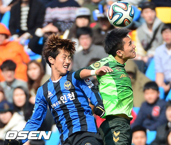 15일 오후 인천광역시 중구 도원동 인천축구전용경기장에서 열린 현대오일뱅크 K리그 클래식 2014 2라운드 인천 유나이티드와 전북 현대 경기, 후반 인천 문상윤과 전북 정혁이 공중 볼 다툼을 하고 있다.