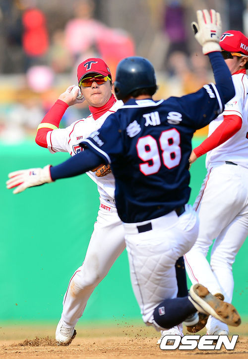 8회초 1사 1,2루 KIA 김선빈이 김재호의 내야 땅볼을 잡아 1루주자 홍재용을 포스아웃으로 잡아낸 뒤 1루로 송구하고 있다.