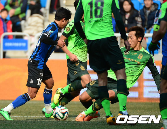 15일 오후 인천광역시 중구 도원동 인천축구전용경기장에서 열린 현대오일뱅크 K리그 클래식 2014 2라운드 인천 유나이티드와 전북 현대 경기, 후반 인천 이천수가 돌파하려 할때 전북 김남일이 몸을 날려 태클을 시도하고 있다.