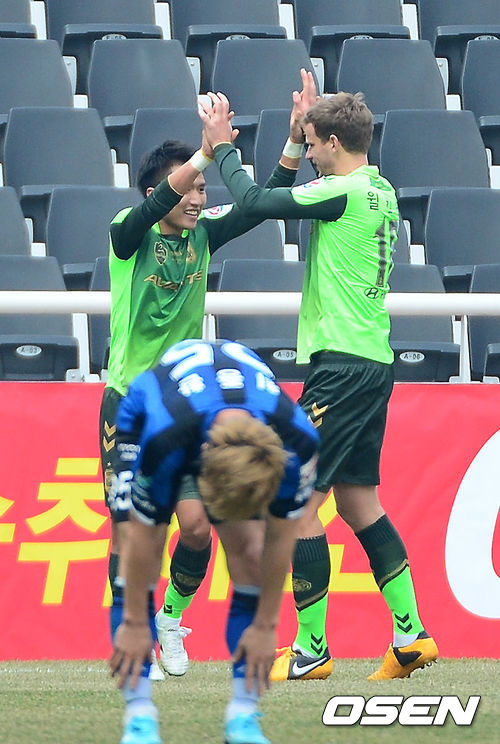 15일 오후 인천광역시 중구 도원동 인천축구전용경기장에서 열린 현대오일뱅크 K리그 클래식 2014 2라운드 인천 유나이티드와 전북 현대 경기, 후반 전북 정혁이 선제골에 성공한 후 기뻐하고 있다.