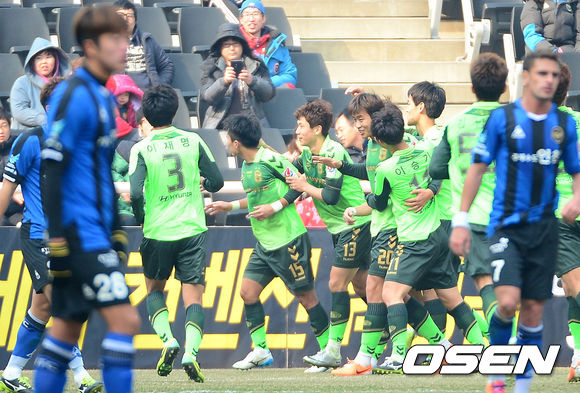 15일 오후 인천광역시 중구 도원동 인천축구전용경기장에서 열린 현대오일뱅크 K리그 클래식 2014 2라운드 인천 유나이티드와 전북 현대 경기, 후반 전북 정혁이 선제골에 성공한 후 동료들과 기쁨을 나누고 있다.