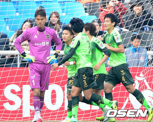15일 오후 인천광역시 중구 도원동 인천축구전용경기장에서 열린 현대오일뱅크 K리그 클래식 2014 2라운드 인천 유나이티드와 전북 현대 경기, 후반 전북 정혁이 선제골에 성공한 후 동료들과 기쁨을 나누고 있다.