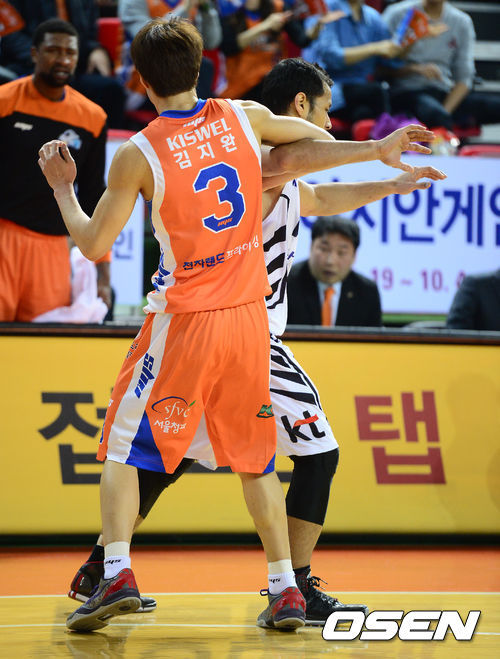 과연 그럴까. 전태풍은 2차전 내내 김지완의 찰거머리 수비에 막혔다. 특히 2쿼터 두 선수는 신경전을 펼치다가 더블 테크니컬 파울을 지적받았다. 전태풍의 전담마크맨 김지완의 목표는 바로 전태풍의 짜증유발이었다.