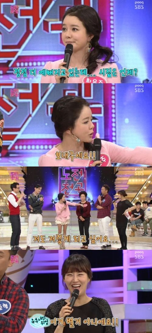 최은주는 16일 방송된 SBS 예능 프로그램 '도전천곡'에 출연해 "결혼 하고 싶다. 시집 보내달라"고 말했다. 이어 그는 만삭인 장윤정을 가리키며 "나도 저렇게 되고 싶다"고 고백, 부러운 마음을 표현했다.