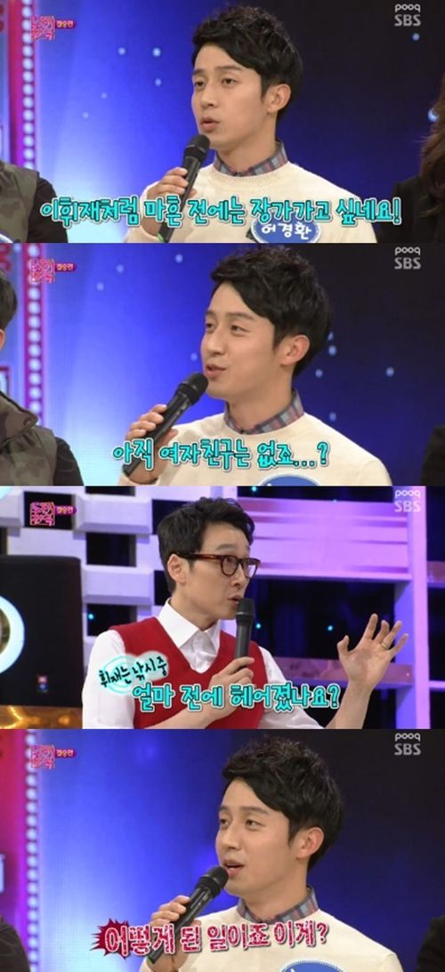 허경환은 16일 오전 방송된 SBS 예능 프로그램 '도전천곡'에 출연, MC 이휘재로부터 연애 관련 질문을 받았다. 이휘재는 "지금은 여자친구가 없는 것이냐", "언제 헤어졌냐", "최근에 헤어진 것이냐"고 쉼없이 질문을 쏟아냈다.