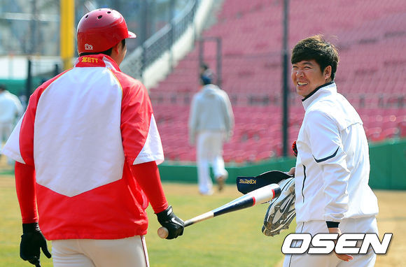 16일 오전 광주-기아 챔피언스 필드에서 열리는 '2014 프로야구' 시범경기 KIA 타이거즈와 두산 베어스의 경기에 앞서 두산 이현승과 KIA 김민우가 이야기를 나누고 있다.