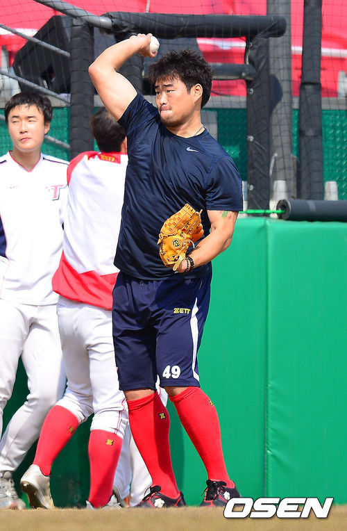 16일 오전 광주-기아 챔피언스 필드에서 열리는 '2014 프로야구' 시범경기 KIA 타이거즈와 두산 베어스의 경기에 앞서 KIA 김진우가 캐치볼을 하고 있다.