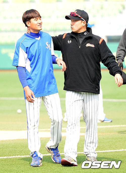 16일 오후 대구구장에서 열리는 '2014 프로야구 시범경기' 삼성 라이온즈와 롯데 자이언츠의 경기를 앞두고, 삼성 김상수와 롯데 손아섭이 인사를 나누고 있다.