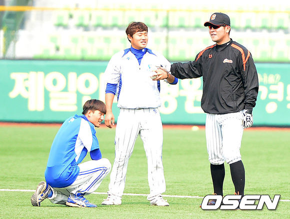 16일 오후 대구구장에서 열리는 '2014 프로야구 시범경기' 삼성 라이온즈와 롯데 자이언츠의 경기를 앞두고, 삼성 이지영과 롯데 강민호가 인사를 나누고 있다.