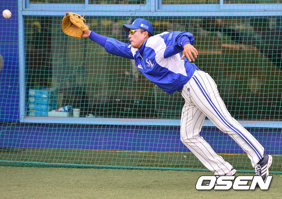 16일 오후 대구구장에서 열리는 '2014 프로야구 시범경기' 삼성 라이온즈와 롯데 자이언츠의 경기를 앞두고, 삼성 이승엽이 수비 훈련을 진행하고 있다.