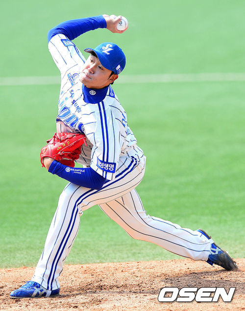 4회초 롯데 공격 1사 1루 상황 마운드에 오른 삼성 투수 이현동이 힘차게 공을 뿌리고 있다.