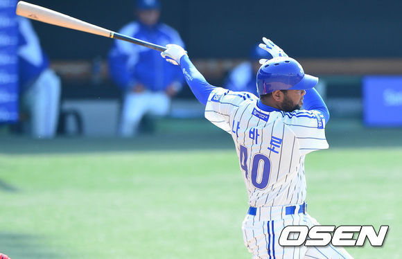 삼성 외국인타자 나바로가 시범경기 첫 홈런을 터트렸다.