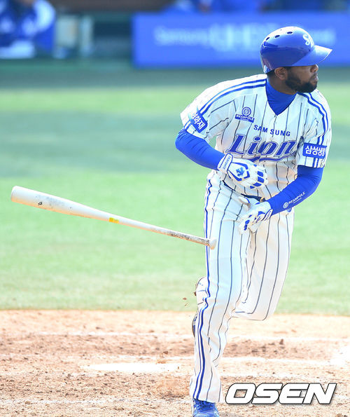 4회말 삼성 공격 1사 1, 3루 상황 나바로가 역전 스리런 중월 홈런포를 날리고 있다.