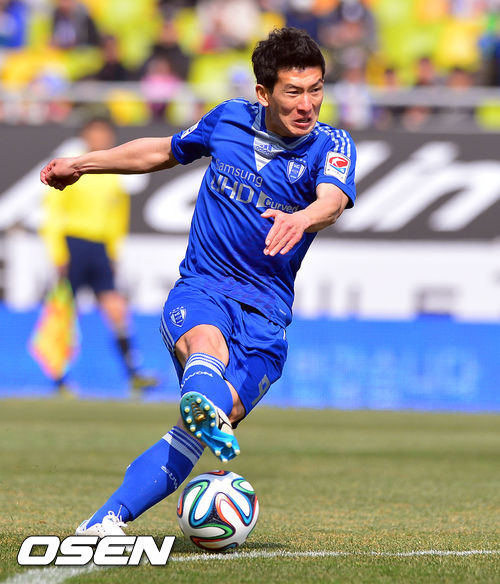 16일 오후 경기도 수원시 수원월드컵경기장에서 열린 '2014 현대오일뱅크 K리그 클래식(1부리그)' 수원 삼성과 상주 상무의 경기, 전반 수원 오장은이 슛을 시도하고 있다.