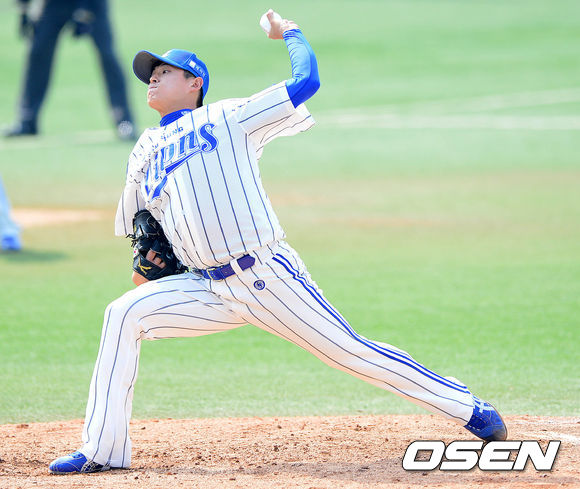 5회초 롯데 공격 1사 1루 상황 마운드에 오른 삼성 투수 임현준이 힘차게 공을 뿌리고 있다.