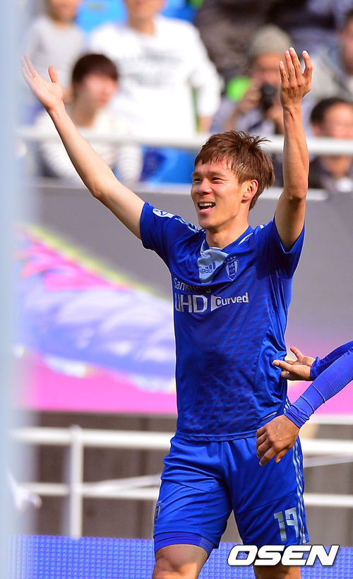 16일 오후 경기도 수원시 수원월드컵경기장에서 열린 '2014 현대오일뱅크 K리그 클래식(1부리그)' 수원 삼성과 상주 상무의 경기, 후반 수원 배기종이 선취골을 넣고 환호하고 있다.