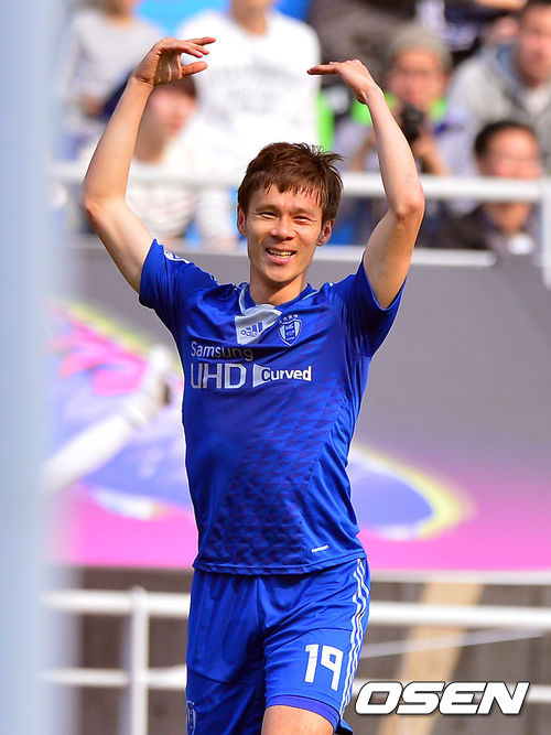 16일 오후 경기도 수원시 수원월드컵경기장에서 열린 '2014 현대오일뱅크 K리그 클래식(1부리그)' 수원 삼성과 상주 상무의 경기, 후반 수원 배기종이 선취골을 넣고 환호하고 있다.