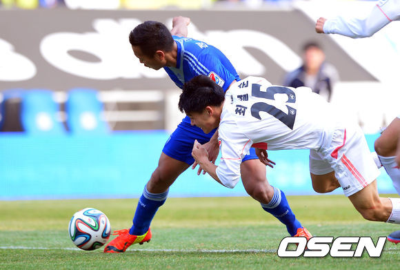 16일 오후 경기도 수원시 수원월드컵경기장에서 열린 '2014 현대오일뱅크 K리그 클래식(1부리그)' 수원 삼성과 상주 상무의 경기, 후반 상무 최철순이 수원 정대세의 돌파를 온몸으로 막아내고 있다.