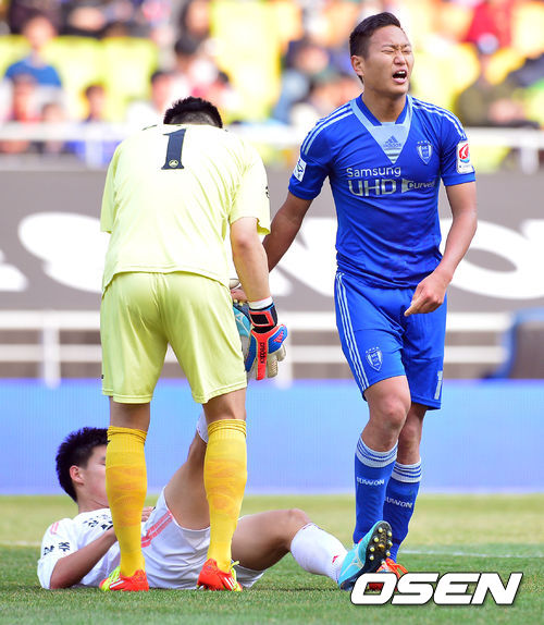 16일 오후 경기도 수원시 수원월드컵경기장에서 열린 '2014 현대오일뱅크 K리그 클래식(1부리그)' 수원 삼성과 상주 상무의 경기, 후반 수원 정대세가 골찬스를 놓친후 아쉬워하고 있다.