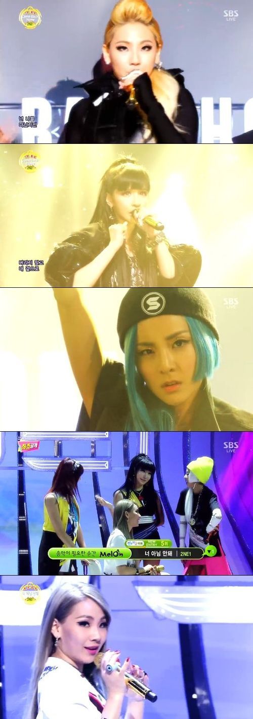2NE1은 16일 오후 3시 5분 방송된 SBS '인기가요'에서 곡 '컴백홈'과 '너 아님 안돼'의 더블 타이틀 곡을 모두 선보였다.