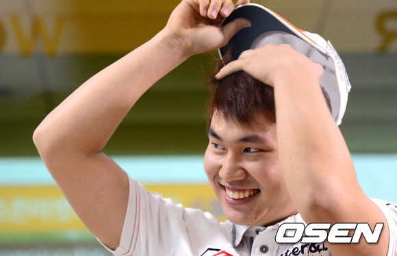 연장 경기가 결정 되자 김민수가 모자를 고쳐 쓰며 미소를 짓고 있다./sunday@osen.co.kr