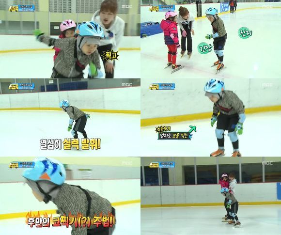 열심히 달리는 윤후의 모습에는 특이한 점이 있었다. 엄지 손가락으로 코를 찍는 특이한 모습으로 빙판 위를 달린 것. 특이한 포즈에도 윤후는 멋지게 빙판을 달렸고 선생님의 격려와 칭찬을 들었다.