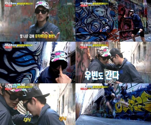 김우빈, 이광수는 16일 방송된 SBS 예능 프로그램 '일요일이 좋다 - 런닝맨'에서 '갑작스럽게' 뮤직비디오 촬영에 나섰다. 예술적인 그래피티들로 장식된 거리를 걷던 두 사람은 "우리 뮤직비디오 한 번 찍어볼까"라고 말한 후 호흡을 맞췄다.
