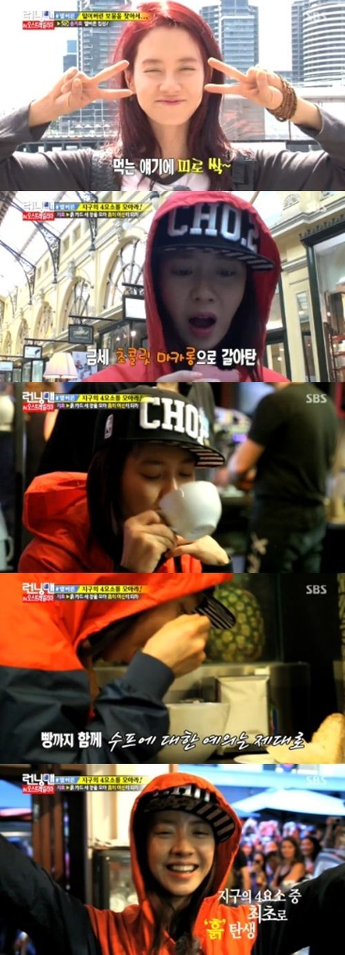 송지효는 16일 방송된 SBS 예능 프로그램 '일요일이 좋다 - 런닝맨'에서 호주 도착 후 마카롱, 스프, 커피를 차례로 맛보는 일명 '먹방'을 선보였다.