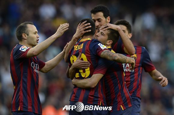 크리스티안 테요의 추가골로 5-0으로 앞선 바르셀로나 선수들이 기쁨을 나누고 있다.