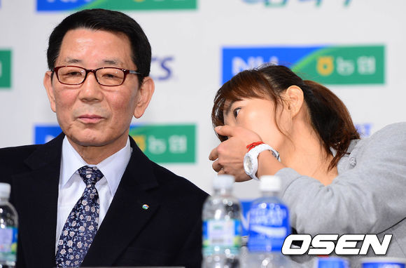 17일 오전 서울 청담동 호텔리베라에서 열린 'NH농협 2013-2014 V리그' 포스트시즌 미디어데이에서 한송이와 이선구 감독이 이야기를 나누고 있다.
