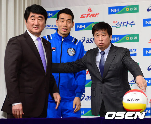 17일 오전 서울 청담동 호텔리베라에서 열린 'NH농협 2013-2014 V리그' 포스트시즌 미디어데이에서 김호철 감독이 신치용 감독에게 가운데로 기념촬영 자리를 안내하고 있다.