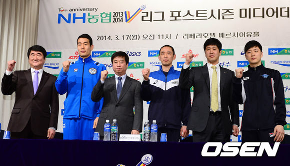 17일 오전 서울 청담동 호텔리베라에서 열린 'NH농협 2013-2014 V리그' 포스트시즌 미디어데이에서 (왼쪽부터)신치용 감독, 고희진, 김호철 감독, 최태웅, 김종민 감독, 강민웅이 포즈를 취하고 있다.