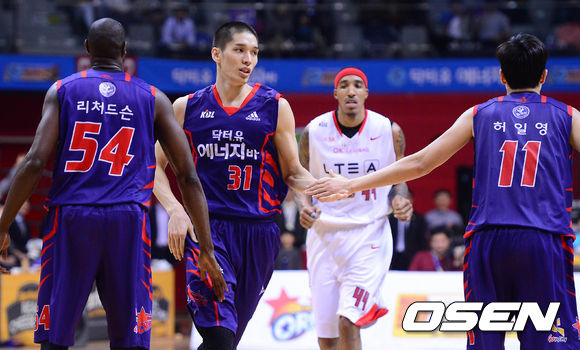 17일 오후 고양시 고양체육관에서 열린 '2013-2014 KB국민카드 프로농구' 6강 플레이오프 3차전 고양 오리온스와 서울 SK의 경기 4쿼터 장재석이 슛을 성공 시킨 후 허일영-리처드슨과 하이파이브를 하고 있다.