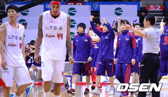 17일 오후 고양시 고양체육관에서 열린 '2013-2014 KB국민카드 프로농구' 6강 플레이오프 3차전 고양 오리온스와 서울 SK의 경기 종료 후 오리온스 선수들이 승리를 기뻐하고 있다.