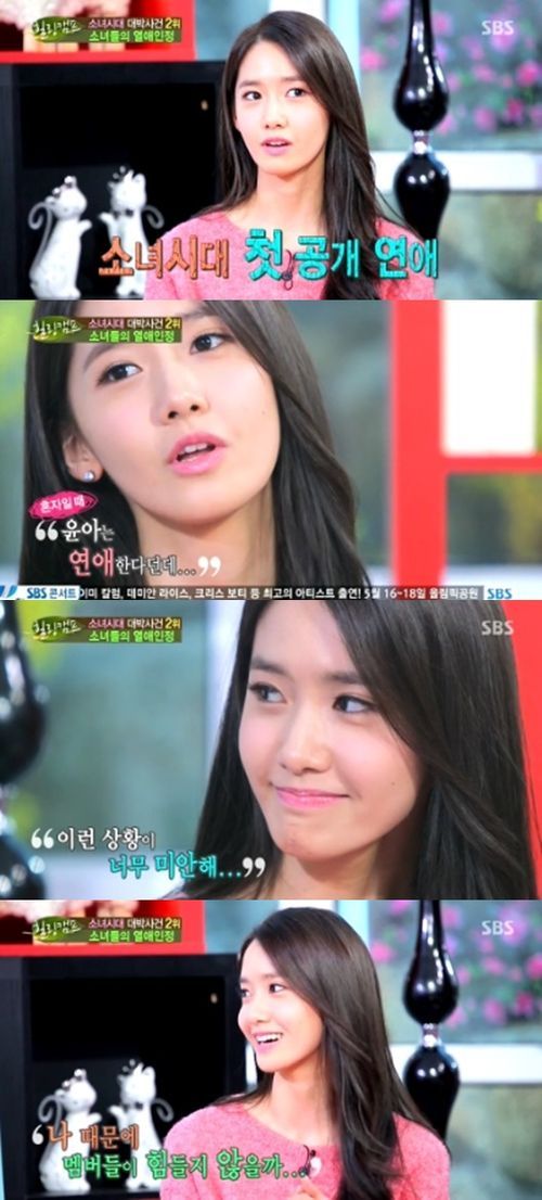 윤아는 17일 방송된 SBS 예능 프로그램 '힐링캠프, 기쁘지 아니한가'에 출연해 "열애 기사가 나와서 이런 상황이 미안하다고 문자를 보냈다. 이런 선례가 없었기 때문에 정말 미안한 마음이 컸다"고 말했다.