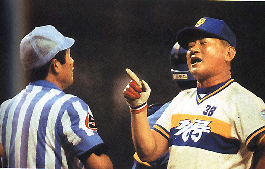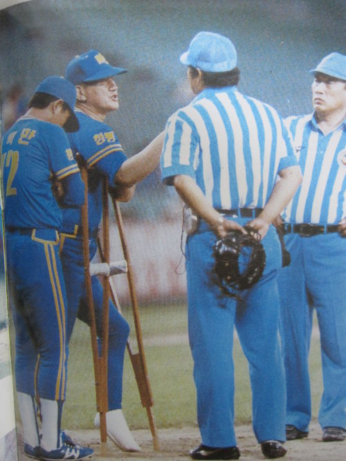“내가 MBC 청룡 감독 시절, 코치들이 나가기 마련인 3루 작전 코치석에 나가 아마추어 롯데 시절처럼 빨간 장갑을 끼고 직접 사인을 내거나, 부러진 다리에 깁스를 하고 목발을 짚은 가운데서도 경기에 참가, 목발을 휘두르며 심판원에게 어필을 한 것도 관중들을 의식한 행동이었다.”