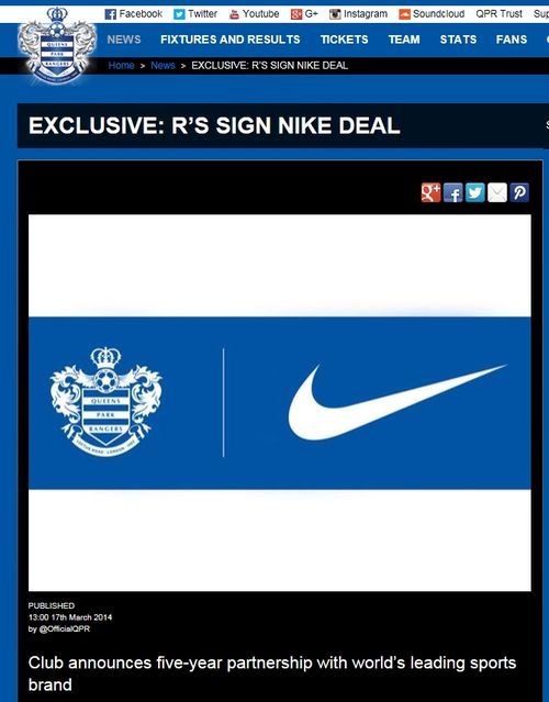 18일(이하 한국시간) QPR은 홈페이지를 통해 "다음 시즌부터 5년간 나이키가 기술적인 파트너로 참여하게 됐다. 여러가지 용품을 받게 됐다"고 발표했다.