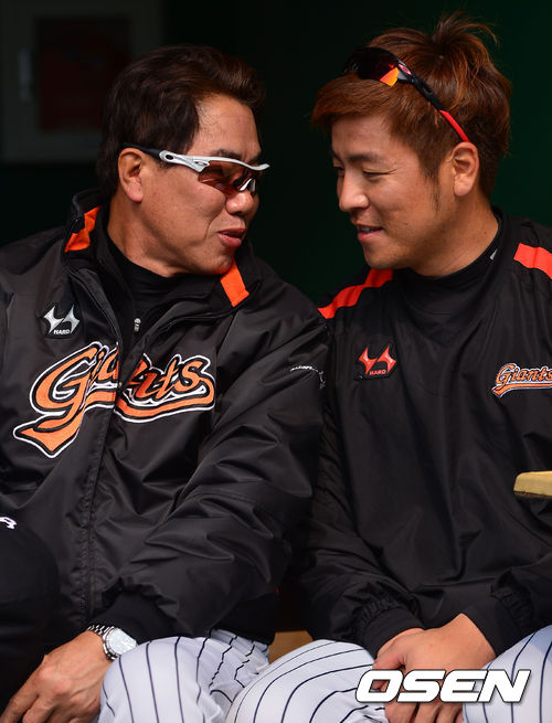 18일 오전 경남 김해시 상동구장에서 열리는 '2014 프로야구 시범경기' 롯데 자이언츠와 LG 트윈스의 경기에 앞서 롯데 김시진 감독이 강민호와 이야기를 나누고 있다.