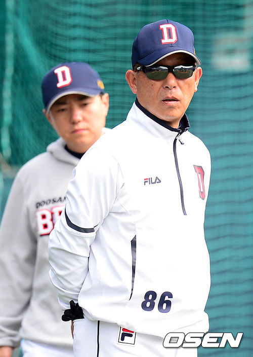 18일 오후 창원 마산야구장에서 열린 '2014 한국야쿠르트 세븐 프로야구' 시범경기 NC 다이노스와 두산 베어스의 경기에 앞서 두산 송일수 감독이 훈련 중인 선수들을 바라보고 있다.
