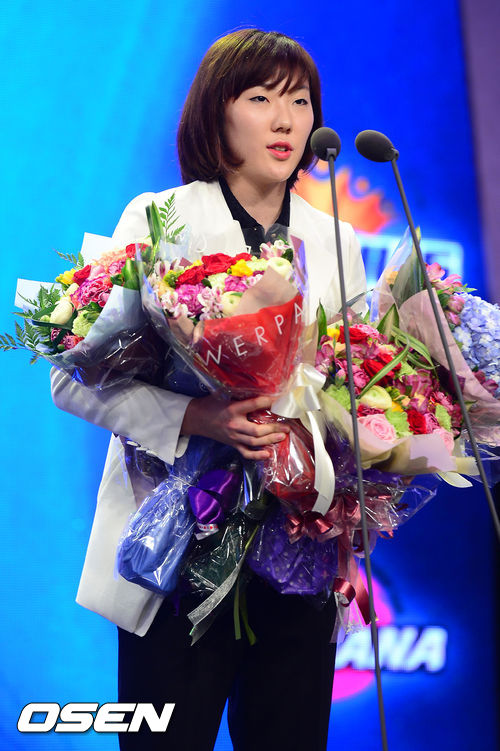 18일 오전 11시 서울 영등포구 63시티 그랜드볼룸에서 열린 '우리은행 2013-2014 여자프로농구 정규리그 시상식', 우리은행 박혜진이 정규리그 MVP를 수상하고 있다.