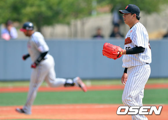 18일 오전 경남 김해시 상동구장에서 열린 '2014 프로야구 시범경기' 롯데 자이언츠와 LG 트윈스의 경기, 1회초 2사 3루 롯데 선발투수 김사율이 LG 벨이 선취 2점 홈런을 허용한후 아쉬워하고 있다