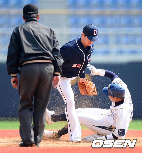 18일 오후 창원 마산야구장에서 열린 '2014 한국야쿠르트 세븐 프로야구' 시범경기 NC 다이노스와 두산 베어스의 경기, 1회말 1사 1루에서 NC 이호준 타석 때 1루주자 이종욱이 도루에 성공하고 있다.