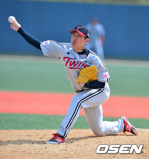18일 오전 경남 김해시 상동구장에서 열린 '2014 프로야구 시범경기' 롯데 자이언츠와 LG 트윈스의 경기, 2회말 LG 선발투수 김선우가 역투하고 있다